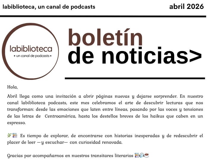 abril> labiblioteca podcastsboletín informativoCentroamérica entre líneasabr 24, 20261CompartirEscúchelo en:Escúchelo en:Escúchelo en:¡Gracias por leer centroamérica entre líneas! Suscríbete gratis para recibir nuevos posts y apoyar mi trabajo.Suscribirse
